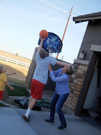 I've said it before & I'm sure I will say it again, but Scoobs is 5 going on 15. For whatever reason, he thinks the 10-12 year old boys in the neighborhood are his 'friends.' He asks regularly if they can come play & gravitates towards them at the park. It cracks me up & I'm fairly certain it has to do with his love affair with Kevin. Kevin happened to be home the weekend of his birthday & this little hoop was my dad & Kevin's gift to Scoobs. Okay...my mom really played a part too, but they were the ring leaders in picking it out. As you can imagine, Scoobs was delighted. As was I. This was on the list to do for Christmas, but I had heard the {blasted} HOA wouldn't let you have them in your front yard...which is where I wanted it. So it got put to the back burner as there wasn't a turn around time for getting a concrete slab poured in our backyard in time. We might still get a notice, but we are a month into it in the front yard & it is getting a TON of use.